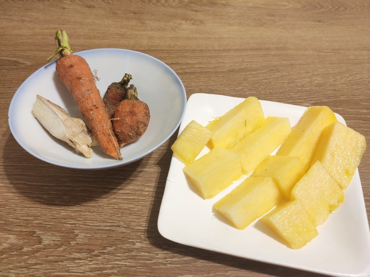 鳳梨心切小塊,洗好紅蘿蔔、薑。