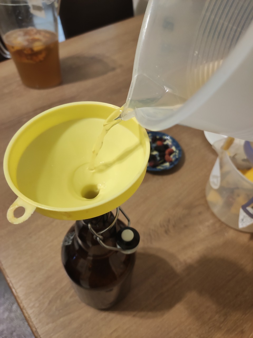 裝入可透氣、非密封的瓶罐子裡,放陰涼處1天後,過濾果皮食材裝在可密封、承受壓力的瓶子,3-4的時間慢慢發酵,薑汁汽水就大功告成~